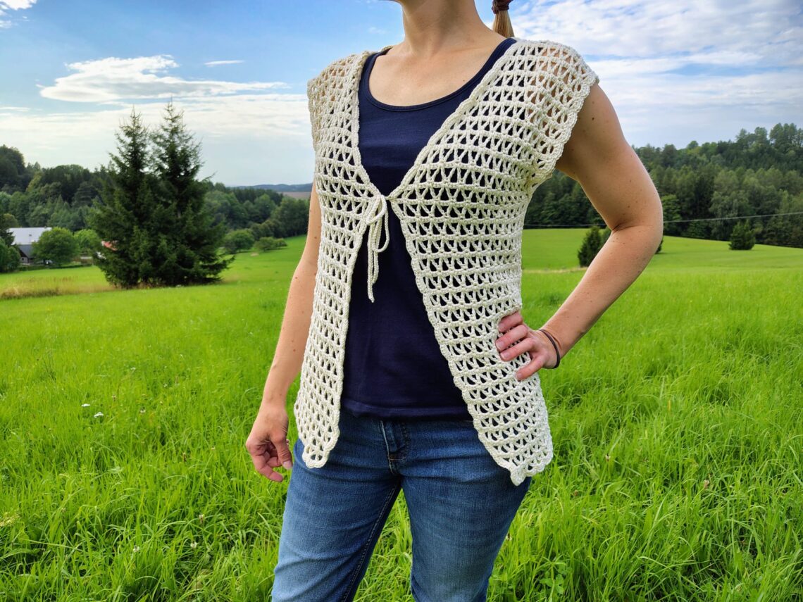I letos háčkované věci frčí, tak co takhle si uháčkovat vzdušný cardigan bez rukávů / vestu, který se dá nosit k džínům, šatům, sukni anebo klidně jen přes plavky? Inspirací pro měl byla úžasná příze Sugar od Lana Gatto – 100% viskóza z cukrové třtiny (!). Dle popisu výrobce je hypoalergenní, antibakteriální a mát termoregulační schopnosti. Hlavně je to úžasný přírodní materiál, který je krásně měkký, decentně lesklý a navíc jde skvěle párat (což jsem si nechtěně ověřila hned několikrát :-D). Přízi je možné koupit tady: www.propleta.cz. Základní info Návod Návod jsem pro Vás zpracovala zdarma. Pokud byste ale chtěli moji tvorbu podpořit, nebudu se zlobit 😉 Děkuji. Zkratky Konstrukce…